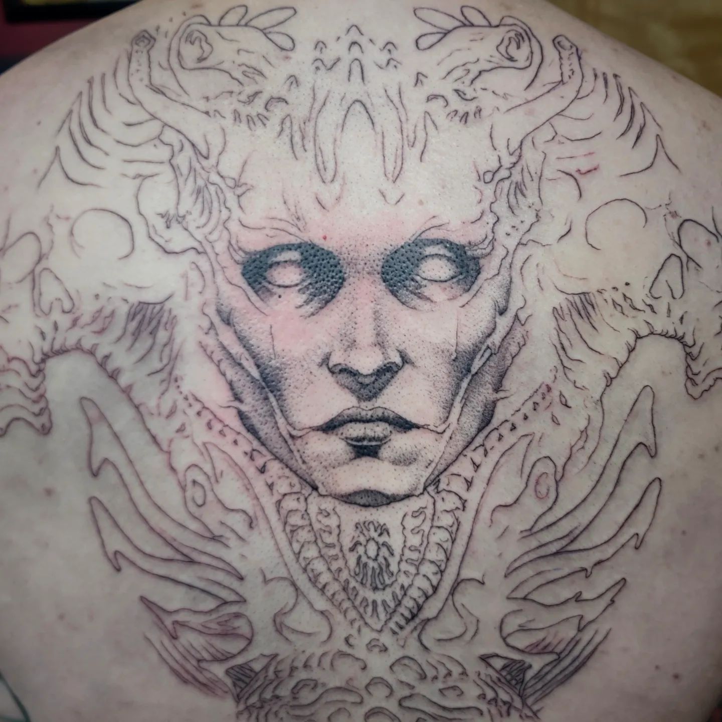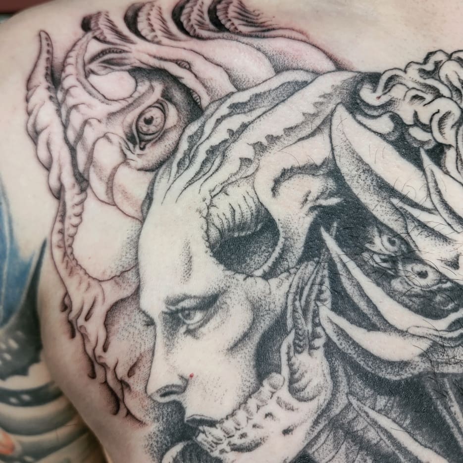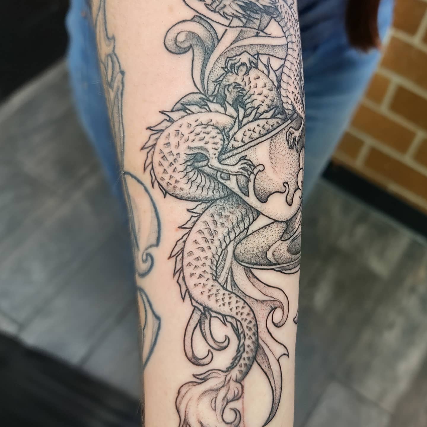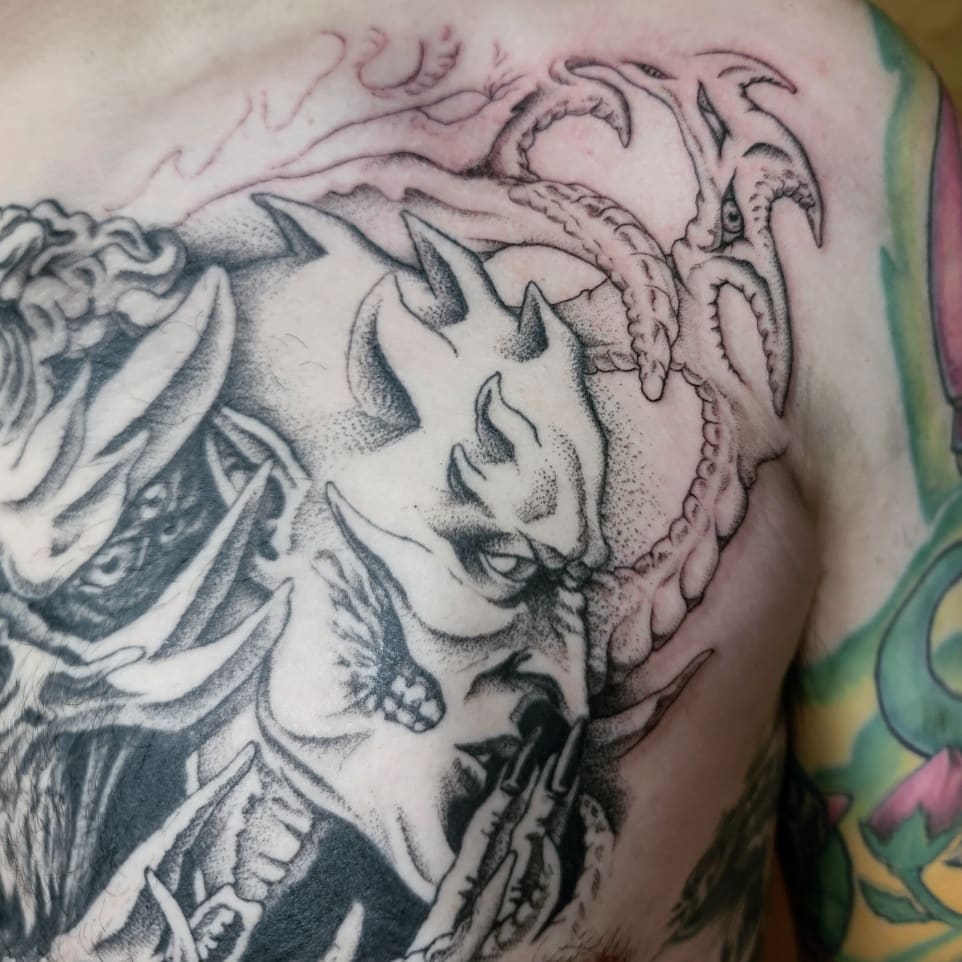 Specializing in illustrative dotwork portraitry, dynamic posing, finelines, and mythical tattoos. Garrett has a plethora of pre-drawn art, and custom options for all your black and grey needs. Micro tattoos and smaller tattoos are also welcome.